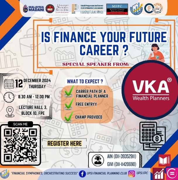 Tanjong Malim, 12 Disember 2024- Umum mengetahui bahawa, bidang kewangan merupakan bidang yang luas kerana merangkumi pelbagai cabang antaranya ialah pelaburan, pengurusan wasiat, pengurusan risiko, dan perancangan kewangan. Kesedaran tentang bidang ini perlu dititikberatkan kepada semua mahasiswa dan mahasiswi Universiti Pendidikan Sultan Idris (UPSI) supaya mereka tahu tentang kewujudannya.