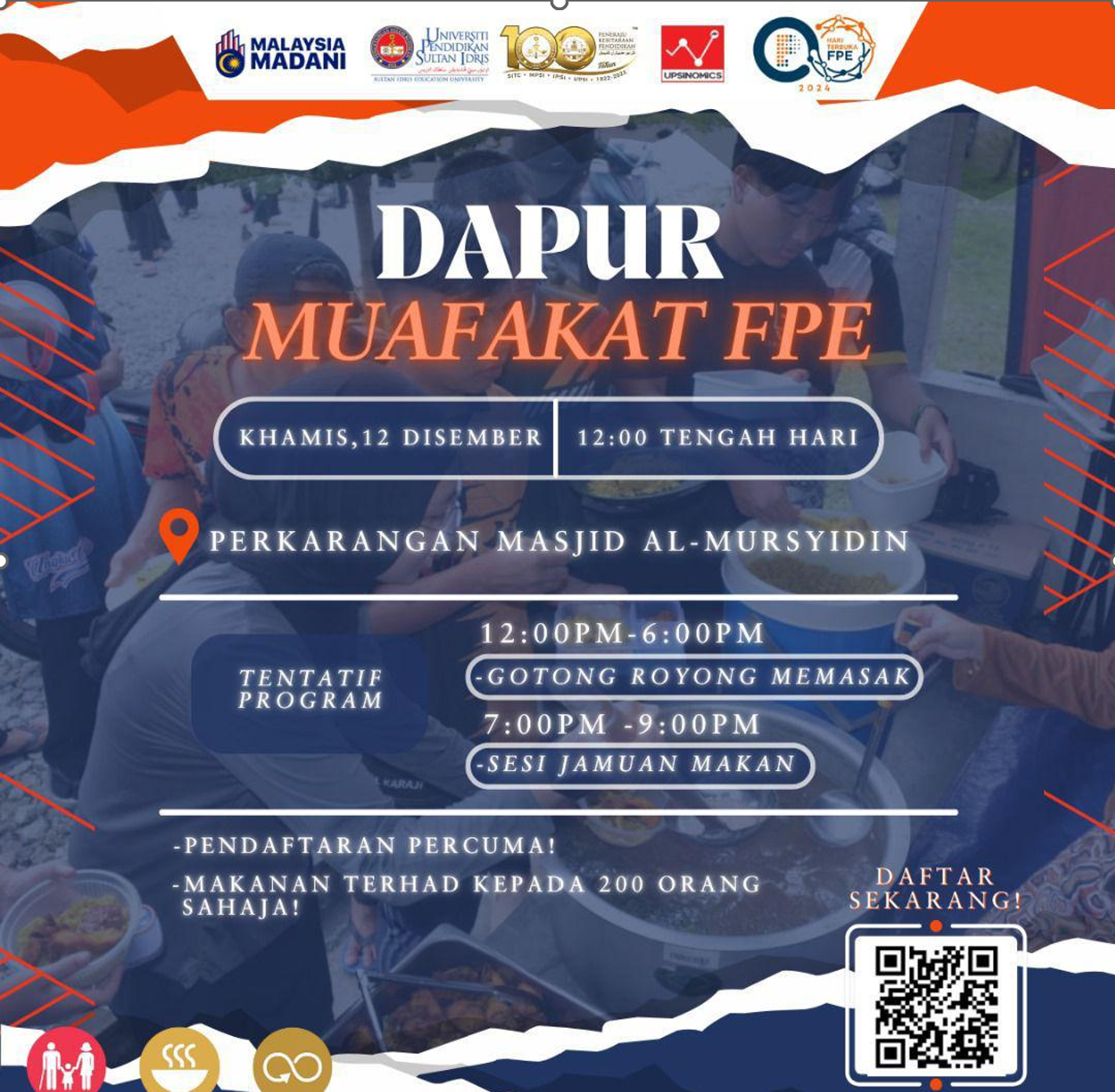 Tanjong Malim, 12 Disember 2024 – Hari Terbuka Fakulti Pengurusan Ekonomi (FPE) Universiti Pendidikan Sultan Idris (UPSI) menjadi lebih bermakna dengan kehadiran ‘Dapur Muafakat FPE’, sebuah inisiatif kebersamaan yang berjaya menyatukan mahasiswa dan ahli akademik. Program ini merupakan hasil kolaborasi erat antara FPE dengan Masjid Al-Mursyidin UPSI. Bertujuan untuk menyemai semangat gotong-royong dan kepedulian sosial, acara ini berlangsung dari pukul 12 tengah hari hingga 9 malam.
