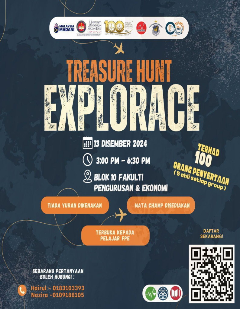 Tanjong Malim, 13 Disember 2024 – Fakulti Pendidikan Ekonomi (FPE), Universiti Pendidikan Sultan Idris (UPSI) menganjurkan program Treasure Hunt Explorace dengan jayanya pada Jumaat lalu. Acara ini berlangsung di sekitar Blok 10 FPE mendapat sambutan hangat daripada warga fakulti. Seramai 80 orang peserta telah menyertai program ini.
