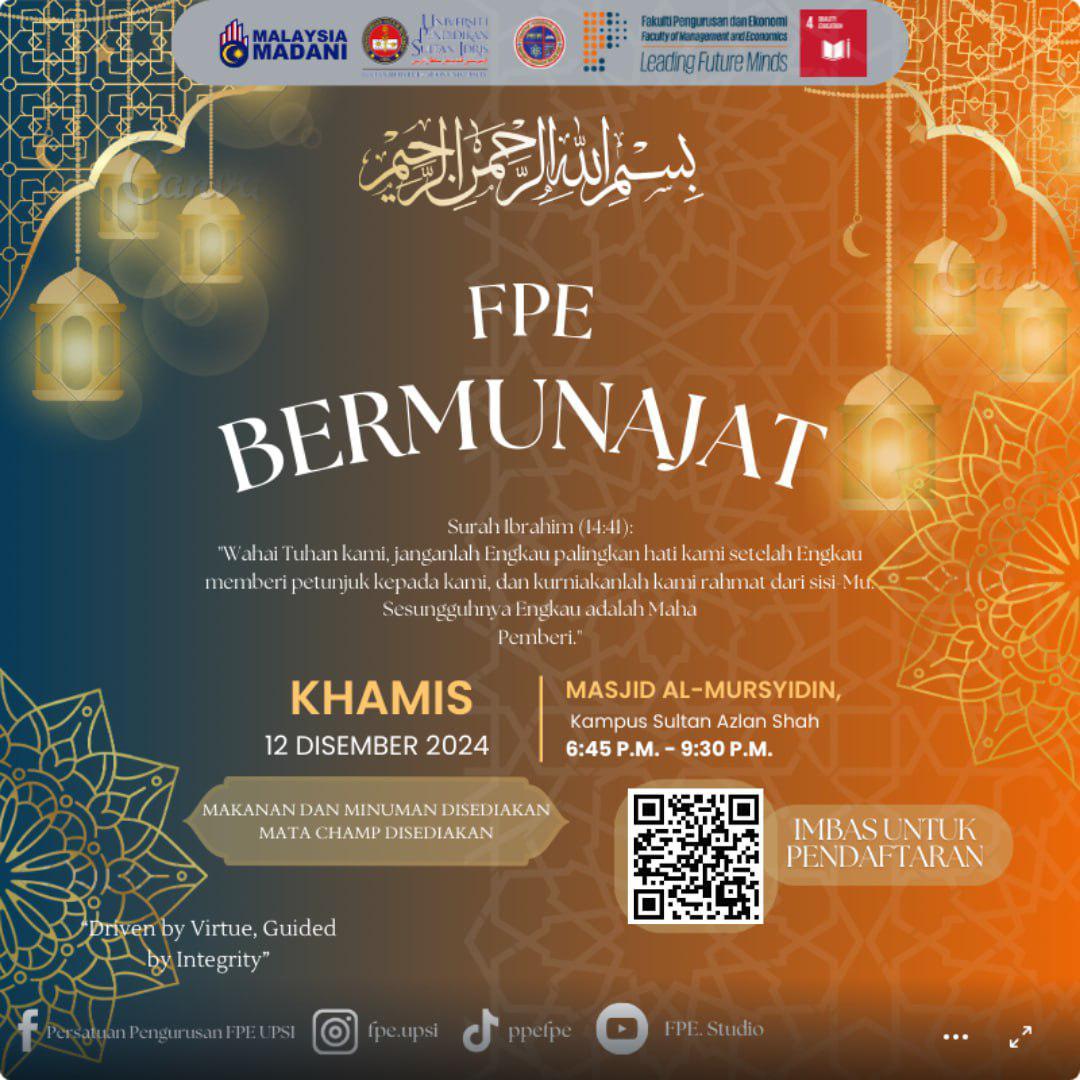 Tanjong Malim, 12 Disember 2024- Lebih 200 orang mahasiswa Universiti Pendidikan Sultan Idris (UPSI) menyertai program Munajat Perdana yang diadakan di Masjid Al-Mursyidin, Kampus Sultan Azlan Shah. Program kendalian Persatuan Pengurusan dan Ekonomi, Fakulti Pengurusan dan Ekonomi (PPEFPE) ini diisi dengan pelbagai acara spiritual dan keagamaan seperti solat hajat, bacaan Yasin dan tahlil bersempena Hari Terbuka Fakulti Pengurusan dan Ekonomi.