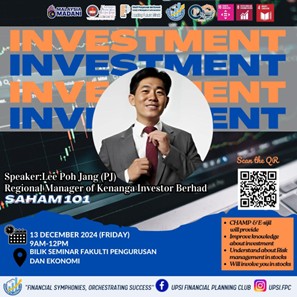 Tanjong Malim, 13 Disember 2024- Universiti Pendidikan Sultan Idris (UPSI) melalui Fakulti Pengurusan dan Ekonomi (FPE) bersama UPSI Financial Planning Club menganjurkan Saham 101 bertujuan untuk memberi pendedahan kepada mahasiswa tentang konsep asas saham, fungsi pasaran saham, dan teknik pengurusan risiko dalam pelaburan.