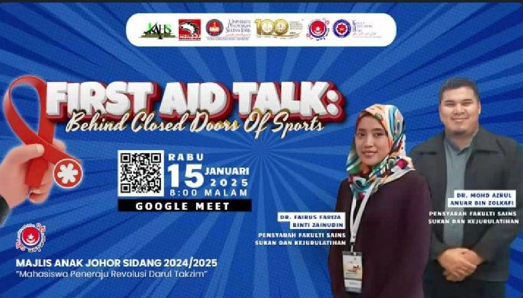 Tanjong Malim,15 Januari 2025- Program ‘First Aid Talk Behind Closed Door of Sports’ yang diadakan secara dalam talian baru-baru anjuran Exco Sukan dan Rekreasi Persatuan Majlis Anak Johor (M@JOR), telah berjaya menghimpunkan lebih daripada 500 orang peserta dari pelbagai latar belakang. Program ini dijalankan dengan kerjasama strategik daripada Fakulti Sains Sukan dan Kejurulatihan (FSSK), Pusat Sukan UPSI, Kolej Awang Had Salleh (KAHS) dan Kolej Aminuddin Baki (KAB), UPSI. Objektif utama program adalah untuk mendalami ilmu pertolongan pertama dalam kecemasan sukan dengan penekanan terhadap kepentingan keselamatan dalam sukan.