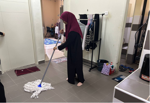 Pelajar telah mengambil langkah proaktif membersihkan kediaman masing-masing yang melibatkan aktiviti membersihkan ruang tamu, bilik tidur dan tandas di setiap rumah masing-masing.