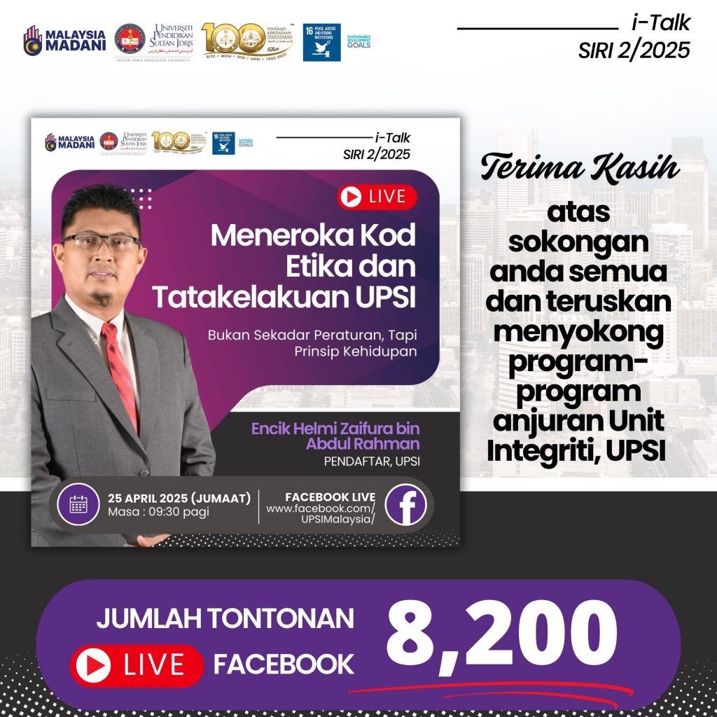 Tanjong Malim, 25 April 2025- Unit Integriti dengan kerjasama Bahagian Governan, Universiti Pendidikan Sultan Idris (UPSI) meneruskan komitmennya dalam memperkukuh budaya integriti dan akauntabiliti dalam kalangan warga universiti menerusi penganjuran program Integrity Talk Siri2/2025. Program ini menggarap isu penting berkaitan etika, budaya kerja berintegriti dan tanggungjawab profesional warga universiti. Program yang berlangsung secara hibrid telah menarik penyertaan warga UPSI daripada pelbagai lapisan termasuk pihak pengurusan, pensyarah, kakitangan sokongan mahupun pelajar.