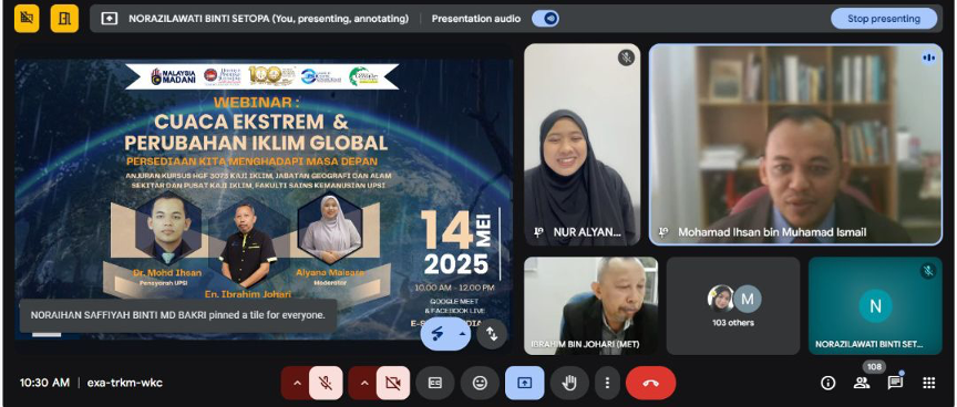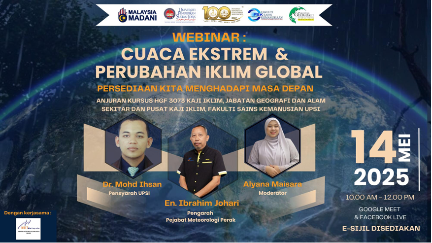 Tanjong Malim, 14 Mei 2025 – Universiti Pendidikan Sultan Idris (UPSI), sekali lagi menunjukkan komitmenmya dalam memperkukuh kesedaran dan ilmu pengetahuan masyarakat melalui penganjuran satu sesi webinar bertajuk “Cuaca Ekstrem dan Perubahan Iklim: Persediaan Kita Menghadapi Masa Depan” yang diadakan menerusi platform Google Meet dan juga disiarkan secara langsung melalui Facebook pada . Webinar ini berjaya menarik perhatian ratusan penonton dari pelbagai latar belakang.
