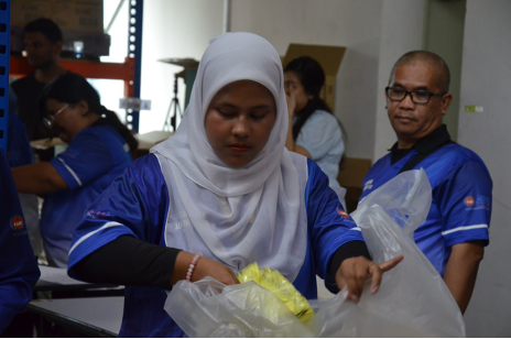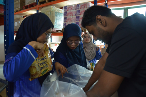 Dalam aktiviti ini, peserta telah melakukan aktiviti memasukkan dan membungkus barangan keperluan asas seperti makanan kering dan barangan harian untuk diagihkan kepada penerima bantuan.