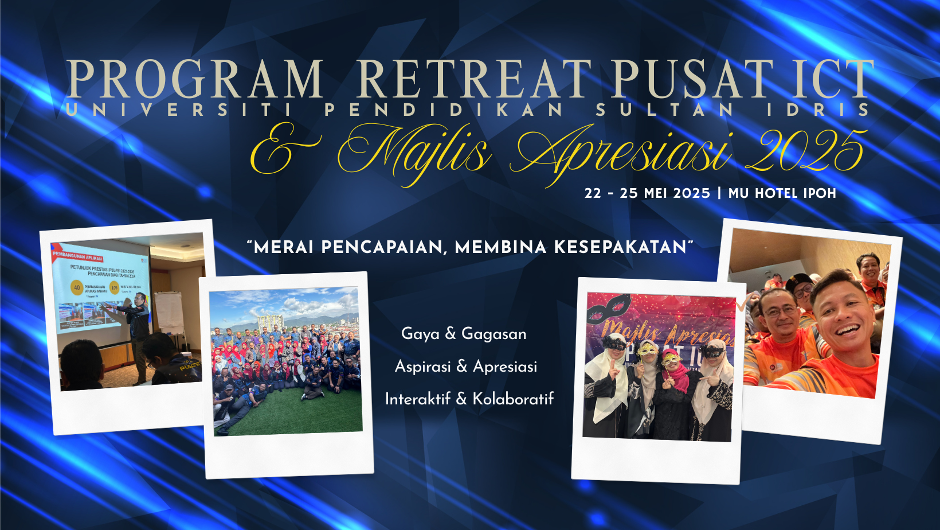 Tanjong Malim, 27 Mei 2025 – Baru-baru ini, warga Pusat Teknologi Maklumat & Komunikasi (PICT) UPSI telah menyertai Retreat Tahunan 2025 yang berlangsung dari 22 hingga 25 Mei di MU Hotel, Ipoh. Program empat hari ini menjadi platform penting bagi menyemak pencapaian semasa dan merangka Pelan Strategik Pendigitalan UPSI 2026–2030, selaras dengan aspirasi universiti ke arah transformasi digital.