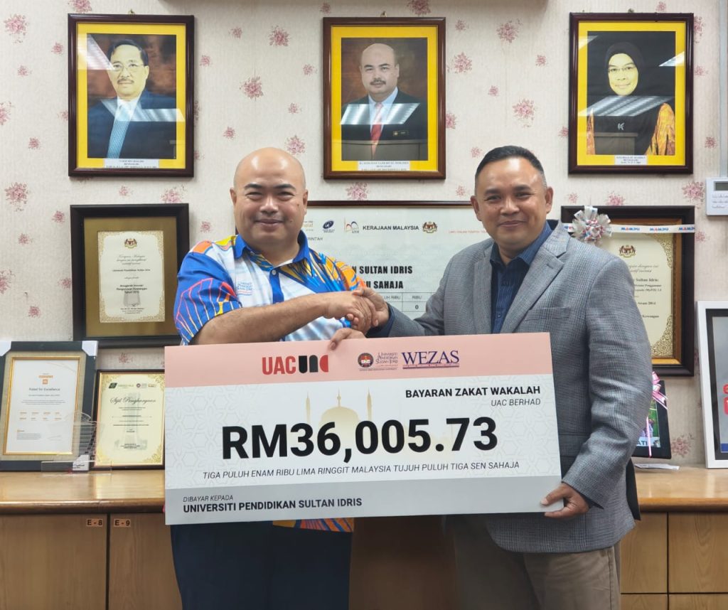 TANJONG MALIM – Universiti Pendidikan Sultan Idris (UPSI) melalui Wakaf, Endowmen, Zakat, Khairat dan Sedekah (WEZAS) menerima sumbangan zakat korporat berjumlah RM36,005.73 daripada UAC Berhad, anak syarikat Lembaga Tabung Angkatan Tentera (LTAT), pada satu majlis ringkas di Bangunan Canselori UPSI, kelmarin.