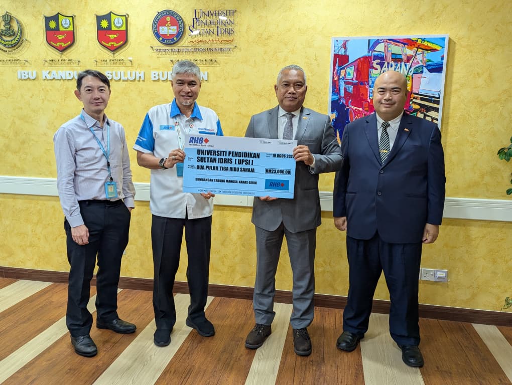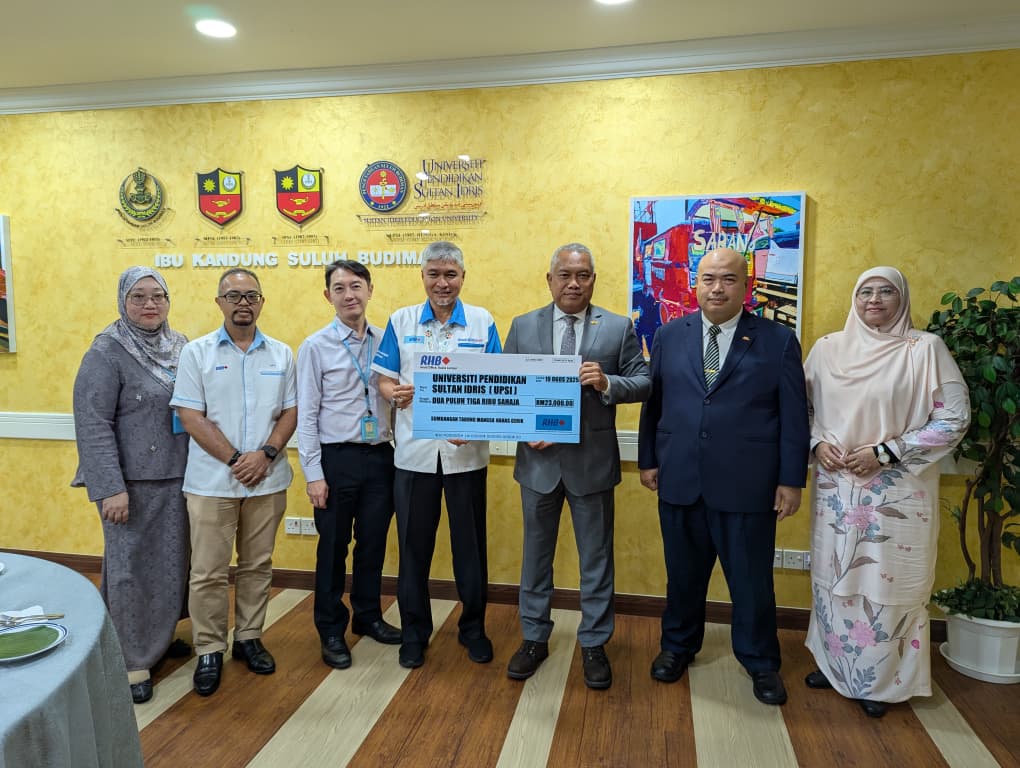TANJUNG MALIM, 19 Ogos – Universiti Pendidikan Sultan Idris (UPSI) menerima kunjungan delegasi RHB Bank yang diketuai oleh En. Razali Mohd Noh@Hashim Ketua Perbankan Islamik RHB yang hadir menyerahkan sumbangan berjumlah RM23,000 kepada UPSI bagi membantu mangsa insiden nahas di Gerik 9 Jun 2025 yang lalu. Sumbangan tersebut disampaikan oleh Encik Razali, Ketua Pembangunan Perniagaan Islamik, RHB, bersama-sama delegasi RHB Negeri Perak disaksikan oleh Pendaftar, Bendahari, dan Ketua Timbalan Pendaftar JHEPA.