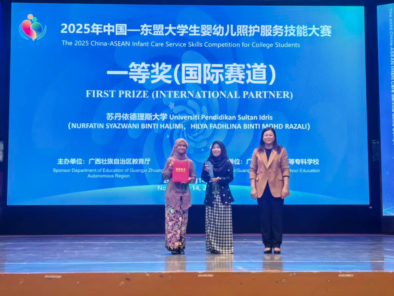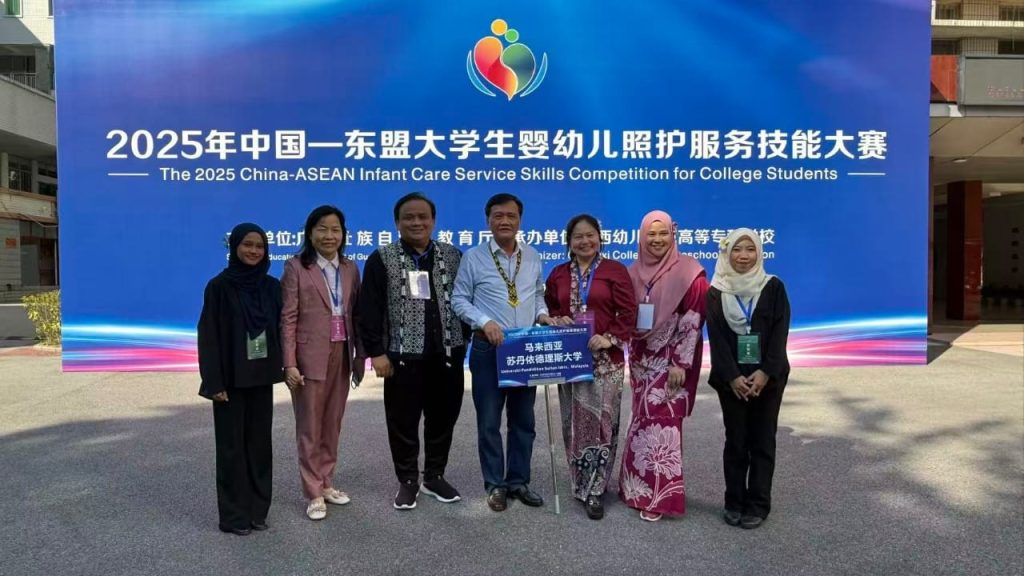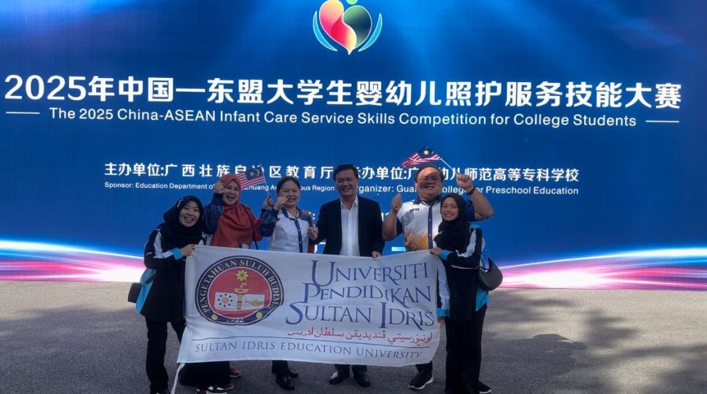 Nanning, Guangxi, China, 14 November 2025 – Universiti Pendidikan Sultan Idris (UPSI) mencatat sejarah baharu apabila dua pelajarnya dari Program Ijazah Sarjana Muda Pendidikan Awal Kanak-kanak, Fakulti Pembangunan Manusia, muncul Johan Kategori Antarabangsa dalam The 2025 China-ASEAN Infant Care Service Skills Competition for College Students yang berlangsung di Guangxi College for Preschool Education dari 12 hingga 14 November 2025.