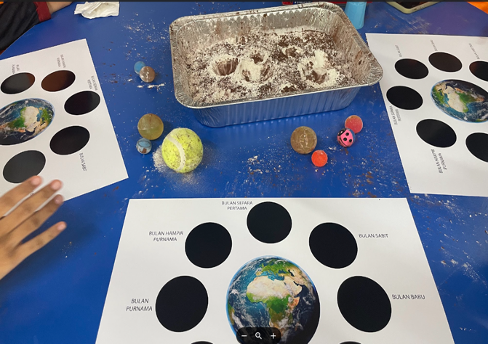 Pelajar mengikuti Modul Pelangi melalui aktiviti Spektrum Cahaya, Reversed Rainbow dan pembinaan Model Matahari 3D, sebelum meneruskan Modul Bulan yang merangkumi simulasi fasa-fasa bulan serta pengenalan kepada konsep meteorit sebenar.