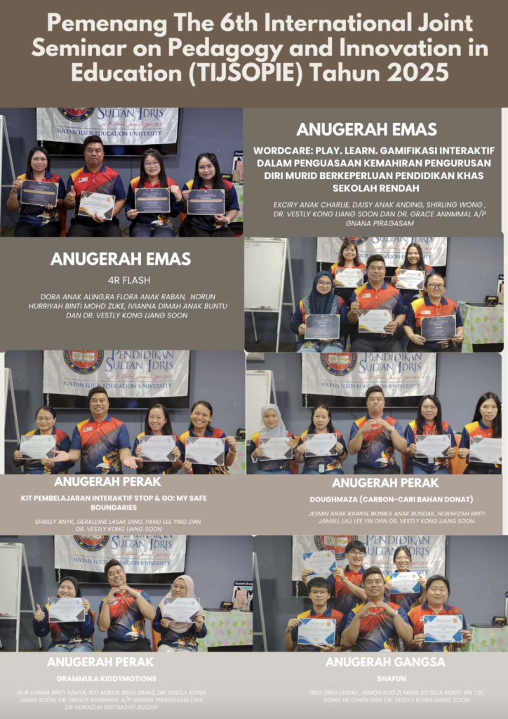 Sarawak, 19 September 2025 – Mahasiswa Universiti Pendidikan Sultan Idris (UPSI) Mod Pesisir Kuching bagi Program Pendidikan Khas mencipta kejayaan membanggakan apabila meraih dua Anugerah Emas, dua Anugerah Perak dan satu Anugerah Gangsa dalam The 6th International Joint Seminar on Pedagogy and Innovation in Education (TIJSOPIE) 2025. Seminar berprestij yang mengangkat tema “Catalysing Pedagogical Innovation” itu menjadi platform antarabangsa untuk mempamerkan inovasi pendidikan kreatif dan aplikatif selari dengan keperluan global. Pencapaian ini membuktikan kemampuan mahasiswa UPSI Mod Pesisir Kuching bukan sekadar menguasai teori pendidikan, malah mampu menterjemahkannya kepada penyelesaian praktikal yang relevan dengan cabaran pendidikan kontemporari.