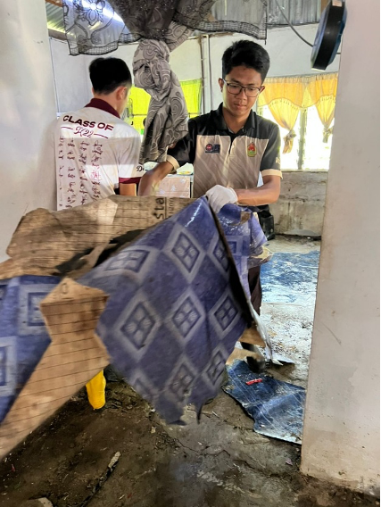 Beberapa rumah penduduk yang ditenggelami air turut dibantu Walaupun berdepan keadaan cuaca tidak menentu, para sukarelawan terus komited melaksanakan tugasan dengan penuh disiplin dan kesungguhan.