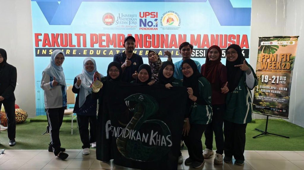 Tanjong Malim, 21 Disember 2025 – Persatuan Mahasiswa Program Pendidikan Khas (PM2PK) di bawah Jabatan Pendidikan Khas telah mencatatkan pencapaian membanggakan apabila berjaya meraih tempat ketiga keseluruhan dalam kejohanan sukan fakulti FPM FIT WEEK 2.0 yang berlangsung selama tiga hari bermula 19 hingga 21 Disember 2025. Kejohanan berprestij peringkat Fakulti Pembangunan Manusia (FPM) ini telah diadakan di Stadium Universiti Pendidikan Sultan Idris (UPSI), Tanjong Malim.