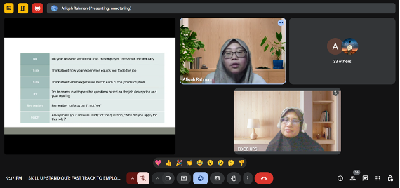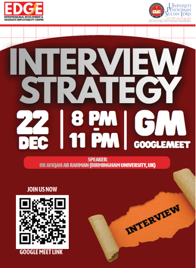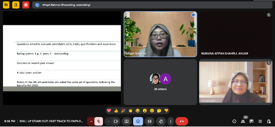 Selain itu, Dr Afiqah turut menghuraikan kaedah menjawab soalan temuduga dengan berkesan, di samping berkongsi “dos and don’ts” yang perlu diberi perhatian oleh calon semasa menghadiri temuduga.