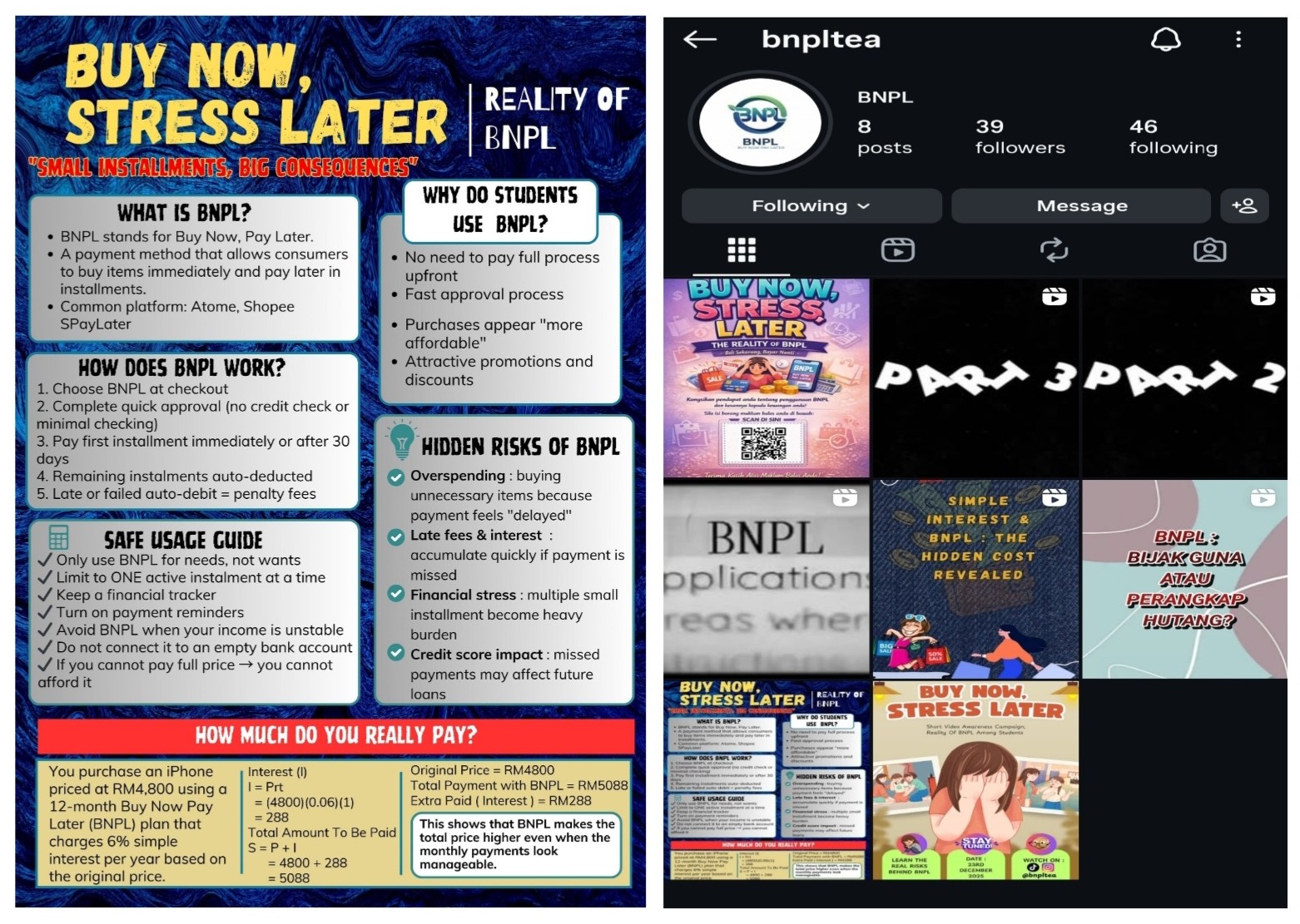 Group D1 focused on the issue of Buy Now, Pay Later (BNPL). They produced videos and infographics to raise UPSI students’ awareness about the risks of BNPL, hidden charges, and to promote understanding of Financial Mathematics concepts such as Simple Interest and Simple Amount.