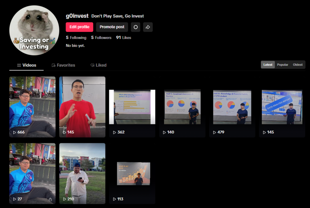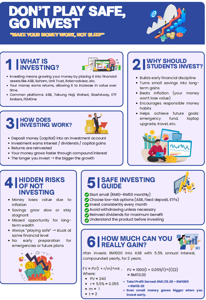 The D2 group focuses on smart investing, conveying the importance of understanding investment concepts , the use of investment websites through social media and To encourage UPSI students to participate in investment activities.. This activity aims to raise awareness among UPSI students to make more informed and prudent investment decisions.