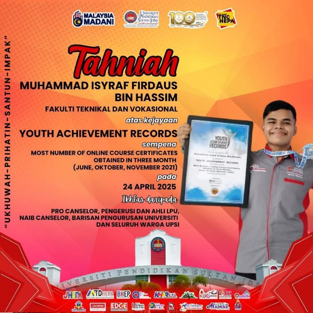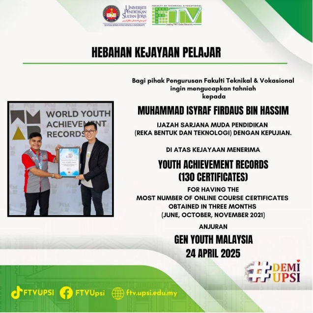 Pelajar ini bernama Muhammad Isyraf Firdaus Hassim daripada Fakulti Teknikal & Vokasional UPSI telah menerima anugerah berkaitan rekod 130 sijil kursus atas talian terbanyak dalam masa 3 bulan. Sebelum memperoleh anugerah ini, terdapat beberapa kriteria yang perlu dicapai seperti memiliki rekod dalam Malaysia Book of Records dan syarat-syarat lain yang berkaitan bagi melayakkan diri mencapainya.