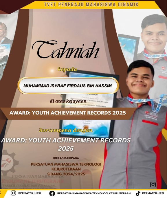Kuala Lumpur, 24 April 2025 – Seorang pelajar Ijazah Sarjana Muda Pendidikan Reka Bentuk & Teknologi daripada Fakulti Teknikal dan Vokasional UPSI telah menerima pengiktirafan anugerah daripada Youth Achievement Record anjuran Gen Youth Malaysia pada 24 April 2025 bertempat di Kuala Lumpur, Malaysia.