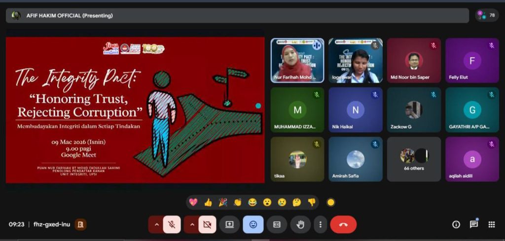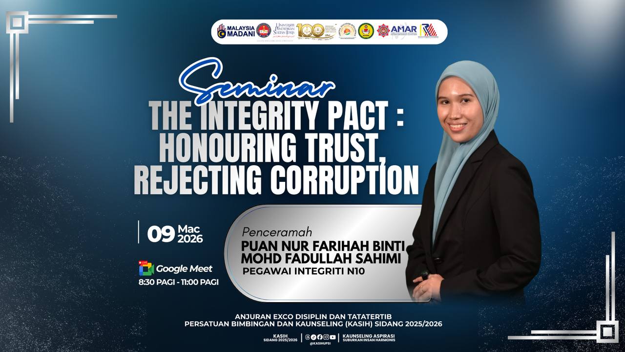 Tanjong Malim, 9 Mac 2026 – Program Seminar The Integrity Pact: Honouring Trust,  Rejecting Corruption telah berjaya dilaksanakan secara dalam talian dengan penyertaan  pelajar serta warga universiti yang menunjukkan komitmen terhadap usaha memupuk nilai  integriti dalam kalangan generasi muda.