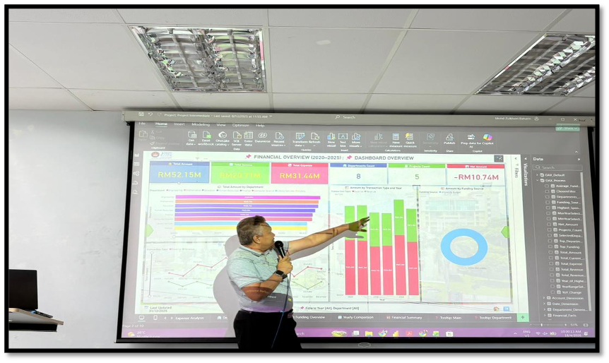 Antara aktiviti yang dijalankan termasuklah sesi penerangan tentang asas penggunaan Microsoft Power BI, demonstrasi penghasilan graf dan carta, serta pembinaan dashboard interaktif.
