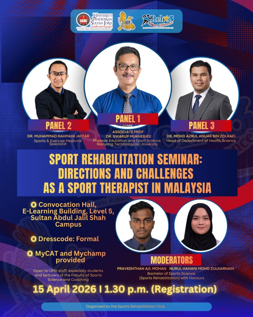 Seminar dan Forum Rehabilitasi Sukan 2026 bertema “Cabaran dan Hala Tuju sebagai Ahli Terapi Rehabilitasi Sukan di Malaysia telah berjaya dilaksanakan, dianjurkan oleh Persatuan Rehabilitasi Sukan di bawah naungan Hal Ehwal Pelajar, Fakulti Sains Sukan dan Kejurulatihan (FSSK), UPSI.
