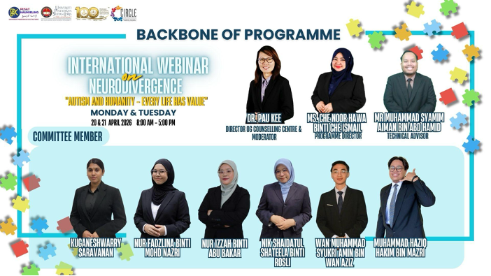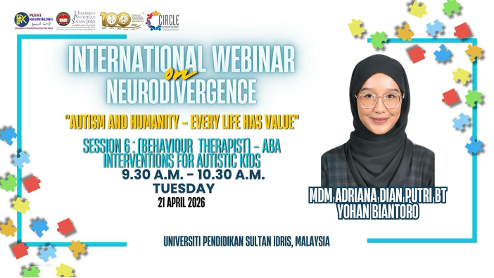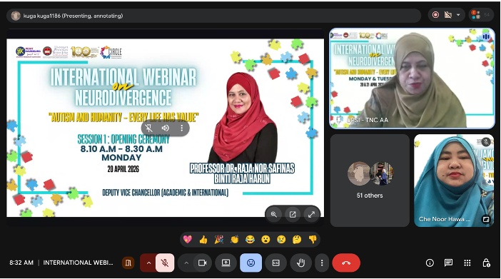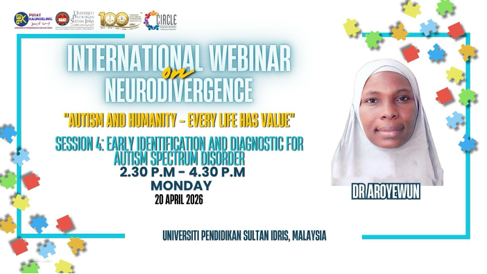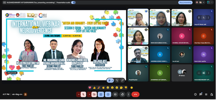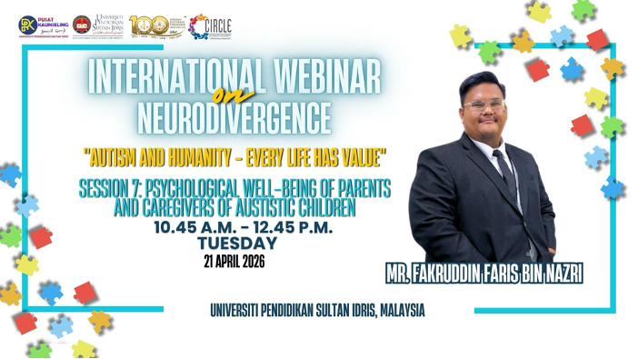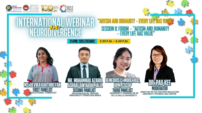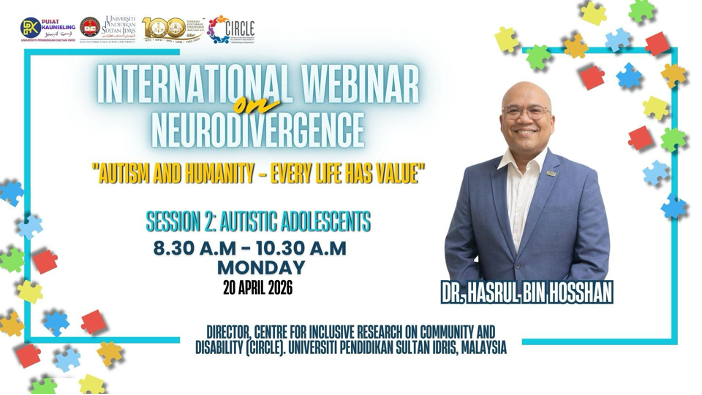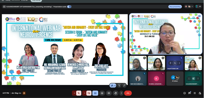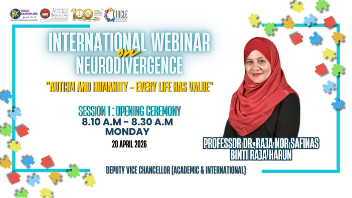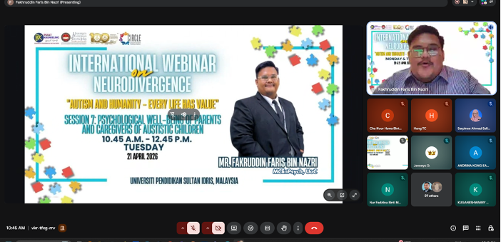 TANJONG MALIM, 21 April 2026— Universiti Pendidikan Sultan Idris (UPSI) menerusi kolaborasi Pusat Penyelidikan Inklusif Komuniti dan Disabiliti (CIRCLE) bersama Sekretariat Task Force OKU Malaysia menganjurkan Program International Webinar on Neurodivergence bertemakan “Autism and Humanity – Every Life Has Value” pada 20 dan 21 April lepas.