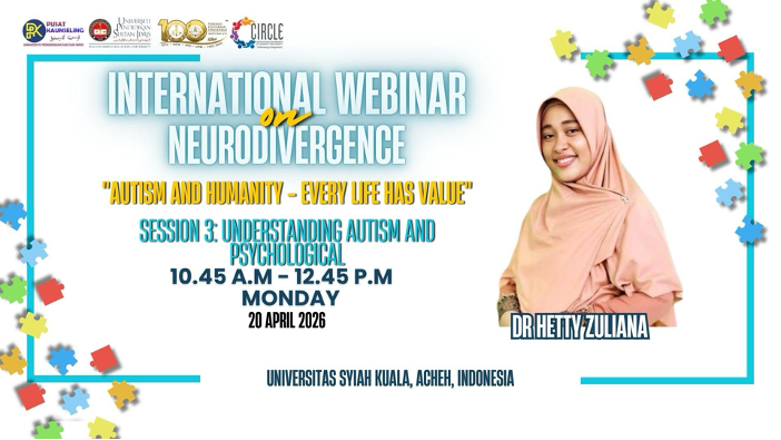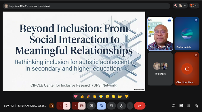 Webinar berkenaan menghimpunkan barisan pakar dari pelbagai negara termasuk Malaysia, Indonesia, Filipina dan Nigeria, sekali gus memperkukuh jaringan global dalam bidang neurodiversiti dan kesihatan mental. Antara penceramah yang terlibat ialah Pengarah CIRCLE UPSI, Hasrul Hosshan yang membentangkan topik Autism and Adolescents, diikuti Hetty Zuliani dari Universitas Syiah Kuala dengan perkongsian mengenai cabaran psikologi individu autistik.