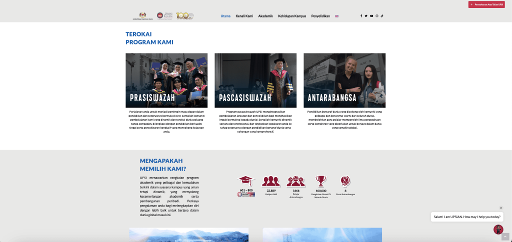 Selain itu, laman berkenaan turut mengetengahkan kemudahan utama yang terdapat di UPSI seperti perpustakaan, fasiliti pembelajaran, pusat penyelidikan, kemudahan sukan dan kehidupan kampus, sekali gus memberikan gambaran menyeluruh tentang pengalaman pembelajaran dan persekitaran universiti kepada pengguna.