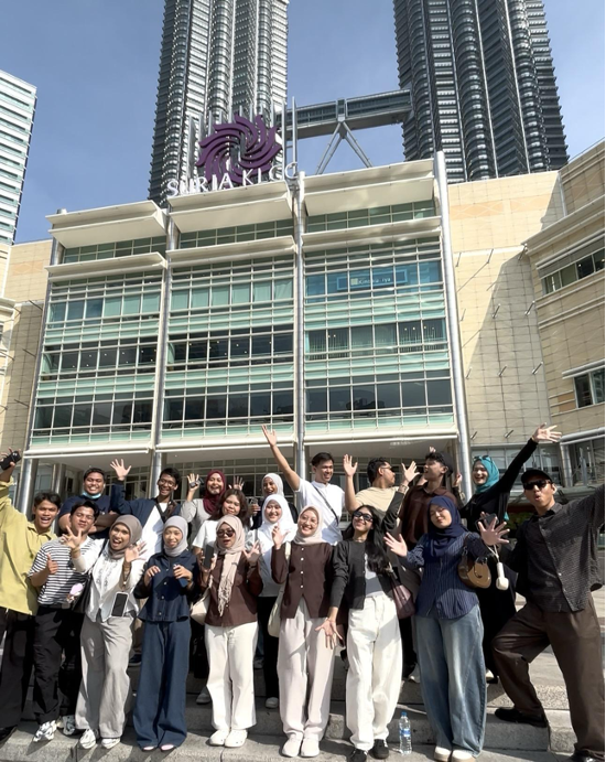 Sesi fotografi bersama mahasiswa UPSI dan delegasi UMBY di Menara Berkembar Petronas (KLCC)