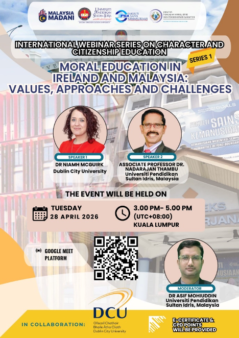TANJONG MALIM – Jabatan Pengajian Moral, Sivik dan Pembangunan Karakter, Fakulti Sains Kemanusiaan (FSK), Universiti Pendidikan Sultan Idris (UPSI) telah menganjurkan sebuah webinar antarabangsa dengan kerjasama Dublin City University (DCU) pada 28 April 2026. Webinar yang berlangsung selama lebih dua jam itu berjaya mencuri tumpuan apabila menarik penyertaan luar biasa melibatkan lebih 400 peserta dari pelbagai latar belakang akademik.